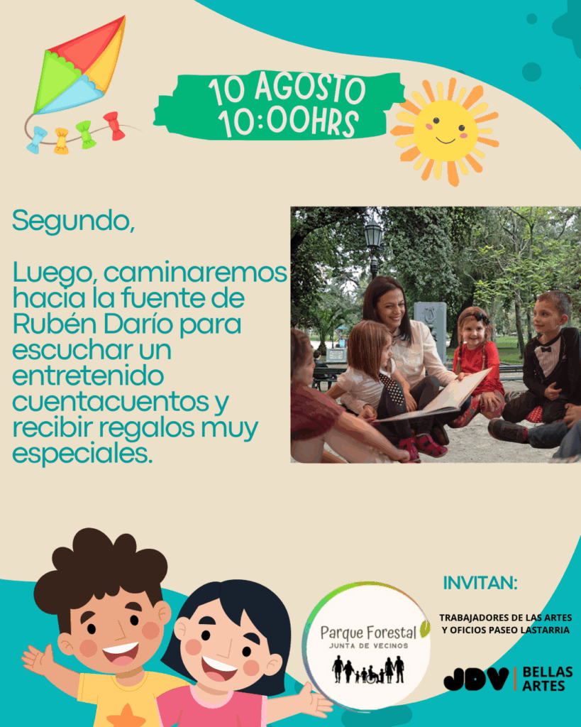 2️⃣ Caminata Mágica y Cuentacuentos 🌳📚 Pasearemos hasta la histórica Fuente de Rubén Darío en el Parque Forestal, donde nos esperará un entretenido cuentacuentos y ¡regalos especiales para cada niño y niña!