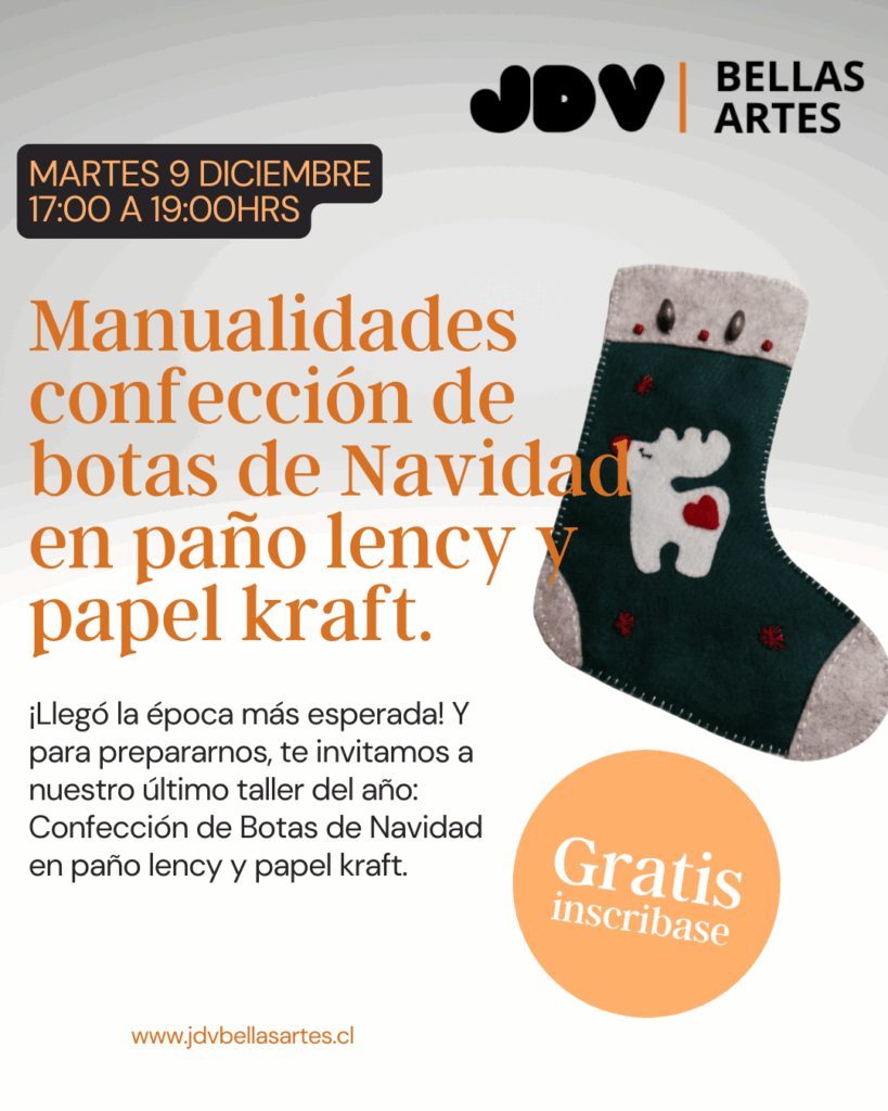 🗓️ Fecha: Martes 9 de Diciembre ⏰ Hora: 17:00 a 19:00 hrs 👩🏫 Tallerista: Sra. Francisca Arraras 📍 Lugar: Nuestra sede JDV Bellas Artes